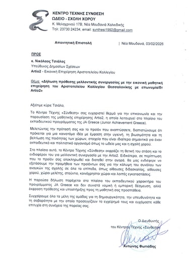 «Η συνεργασία με το Κέντρο Τέχνης Σύνθεση αποτελεί μια σημαντική ευκαιρία για την Artio2 να συνδέσει την καινοτομία με τον πολιτισμό, δημιουργώντας λύσεις που βελτιώνουν την καθημερινότητα και ενισχύουν την περιβαλλοντική υπευθυνότητα», δήλωσε η CEO της Artio2, Ραφαέλα Τρυφωνίδου.